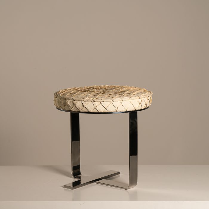 descrição Mesa lateral em aço inox polido e assento revestido com couro de pirarucu da arquiteta e designer Vivian Coser. consultar opções de cores.