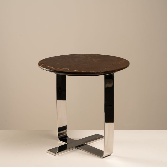 descrição Mesa lateral em aço inox polido e tampo em pedra natural bronzite da arquiteta e designer Vivian Coser. consultar opções de pedras disponíveis.