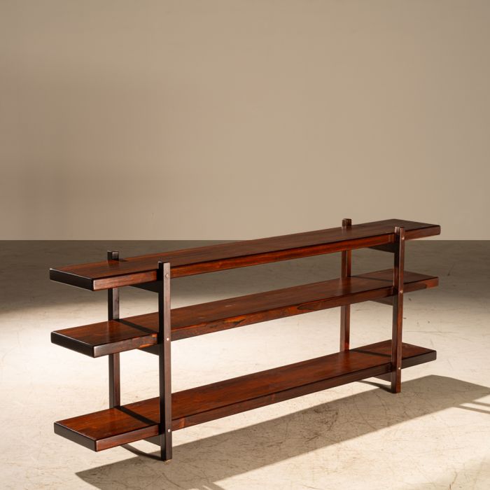 descrição Aparador em Jacarandá com três platôs e guarnições em metal de Sergio Rodrigues